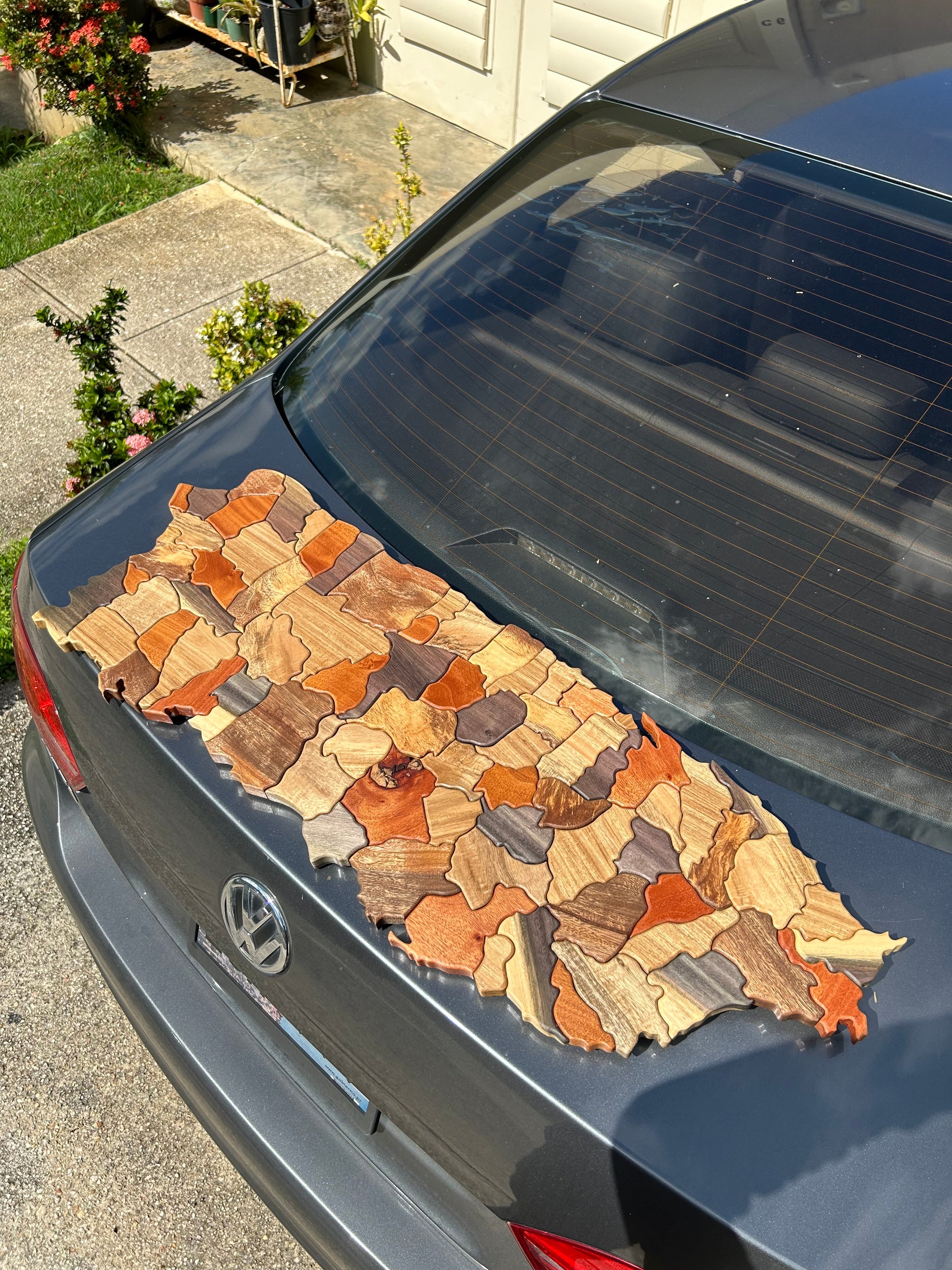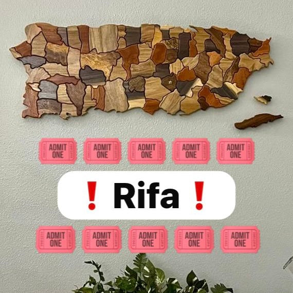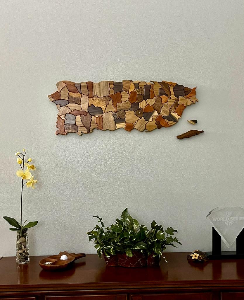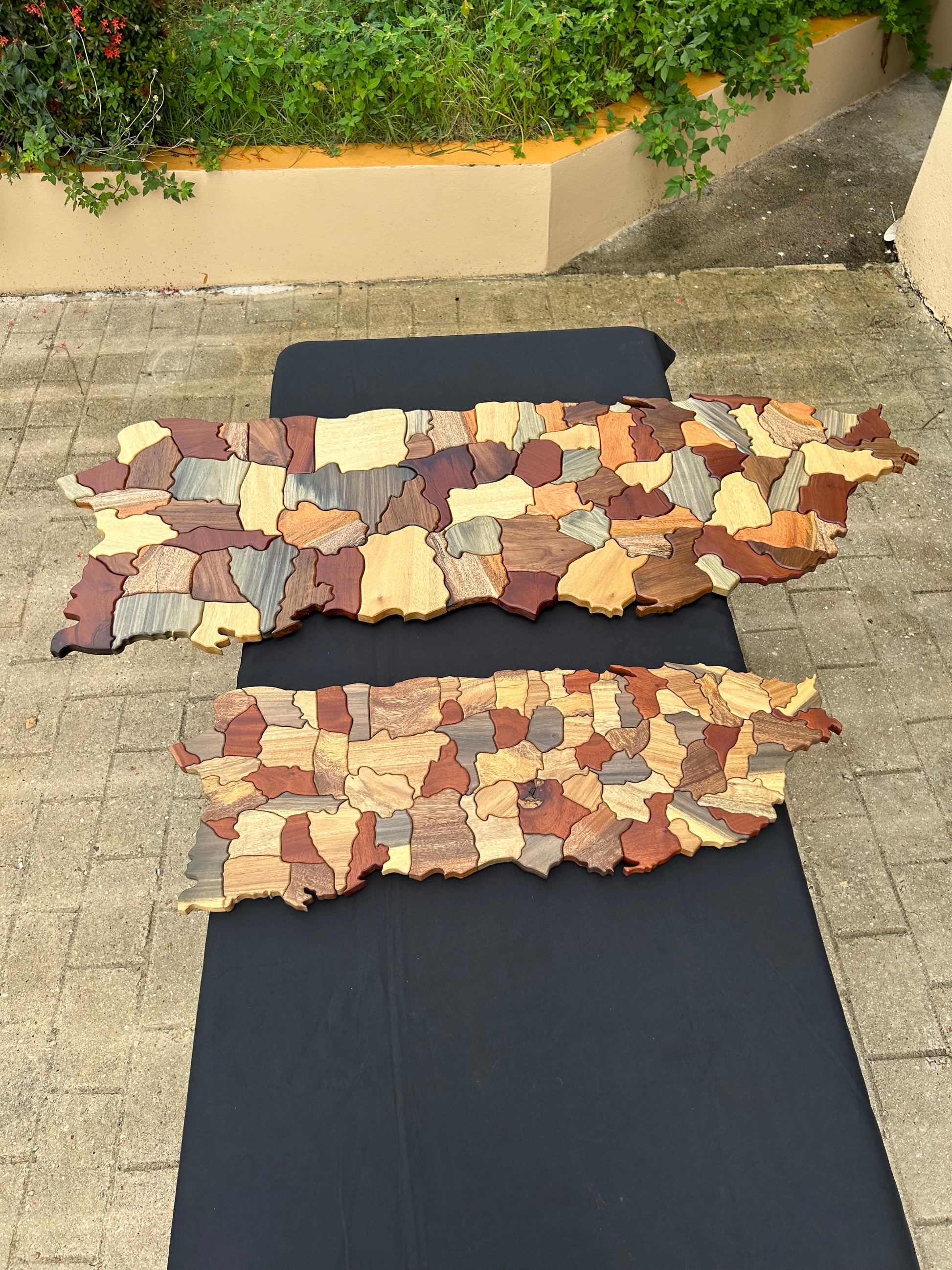 Participa por un mapa de Puerto Rico🇵🇷 creado utilizando 5 maderas nativas. El tamaño de la isla es de 3’ ft de ancho por 1’ ft de alto.